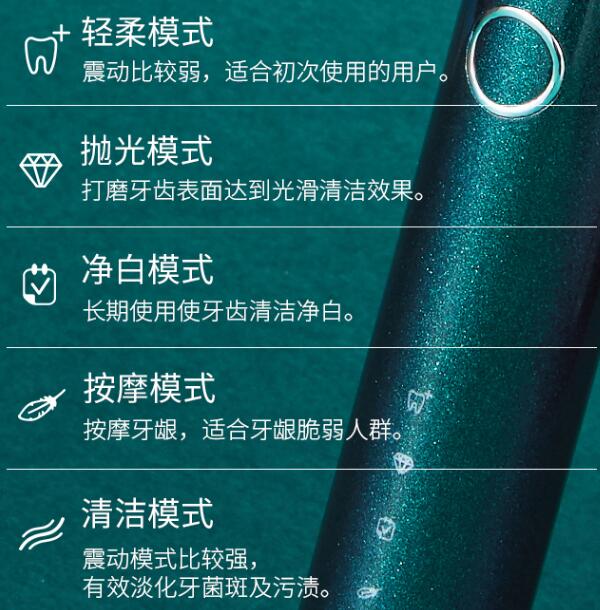 【S300 智能聲波電動(dòng)牙刷】在性能上也同樣優(yōu)秀,模式記憶功能,電動(dòng)牙刷停止刷牙運(yùn)行后,下次即可繼續(xù)使用上次的刷牙模式,甩掉再次選擇模式的苦惱。此外,在外觀上,這款成人敏感牙齦電動(dòng)牙刷也很受都市白領(lǐng)們的歡迎。一鍵式的全功能切換簡(jiǎn)約設(shè)計(jì),契合簡(jiǎn)約美感;同時(shí)顏色的搭配上,拋開(kāi)了千變一律的黑白色調(diào),采用多種高顏值的色彩點(diǎn)綴,滿足不同了風(fēng)格人群的使用,例如:皓月白的優(yōu)雅、睿智黑的炫酷、深邃藍(lán)的莊重及冷光藍(lán)、冷光綠的舒緩及深遠(yuǎn)……