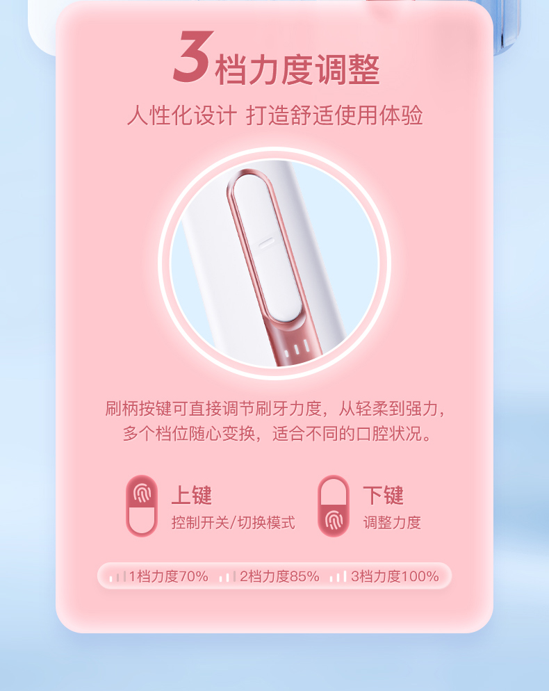 3、一鍵切換五種清潔模式,3檔力度調(diào)節(jié),隨心選擇適合自己的模式